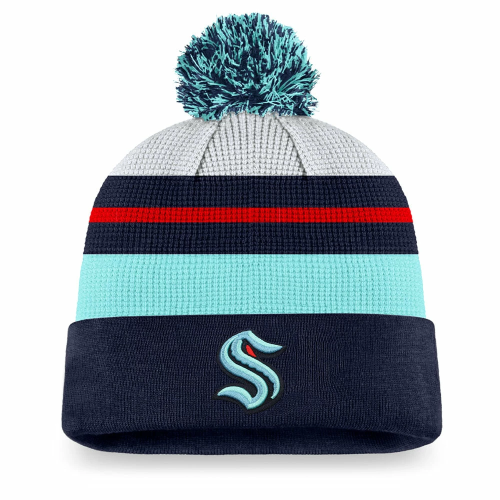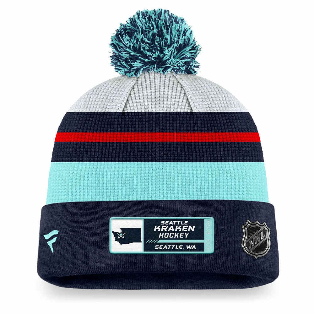 Wear what the next bright stars of your favourite team wears with the Fanatics Authentic Pro Draft Collection. This Beanie toque comes in the style of the Seattle Kraken featuring striping similar to their jerseys. A cuffed fit and a pom top provides vintage, old school styling.