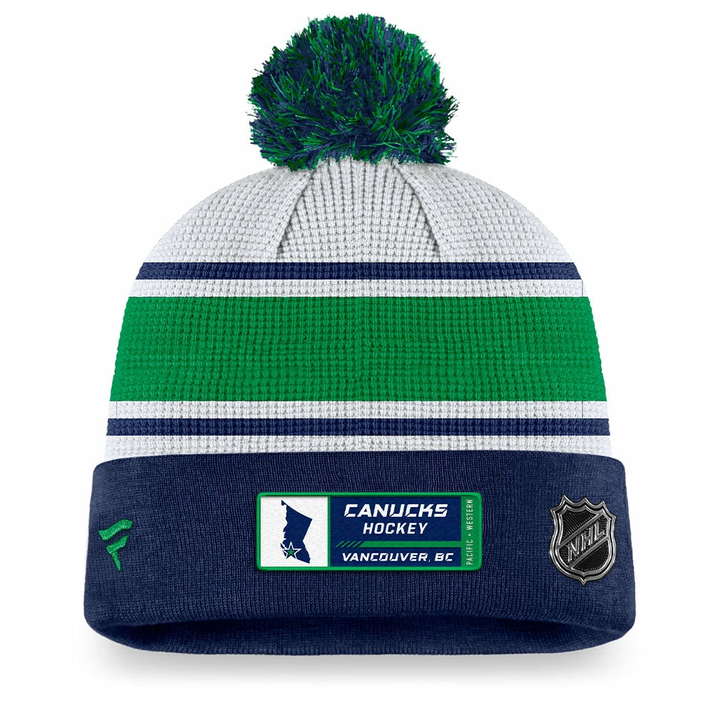 Wear what the next bright stars of your favourite team wears with the Fanatics Authentic Pro Draft Collection. This Beanie toque comes in the style of the Vancouver Canucks featuring striping similar to their jerseys. A cuffed fit and a pom top provides vintage, old school styling.