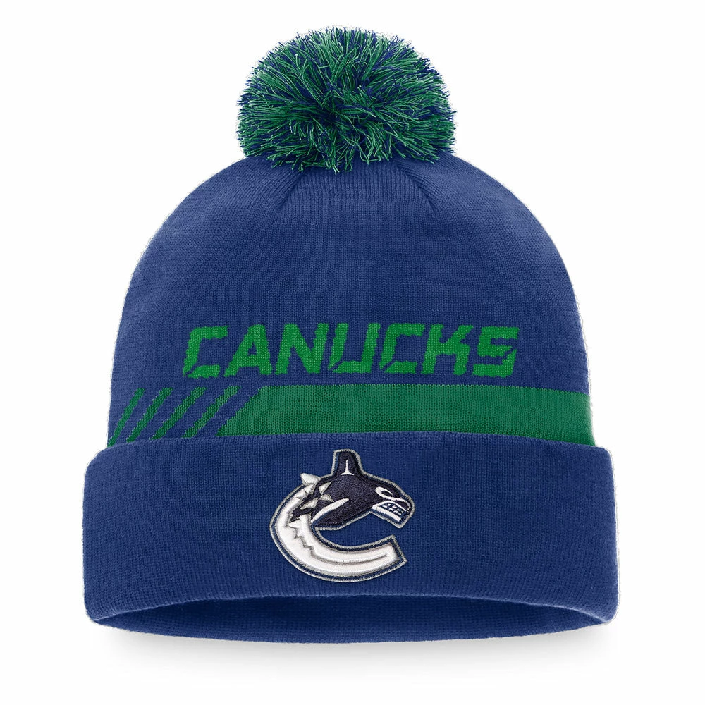 Wear what the pros wear with this Official Locker Room toque from Fanatics featuring a cuff design with a pom on top and an embroidered Vancouver Canucks logo on the front.